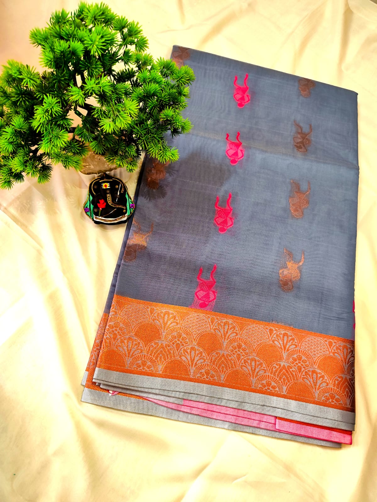 Fancy Cotton Sarees, Motifs such as Ash with Pink colours, More affordable but lightweight alternative