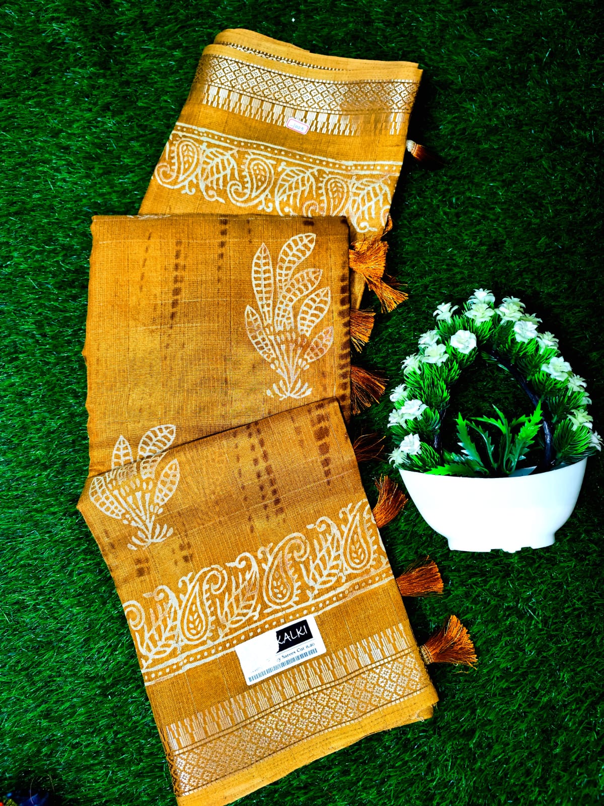 Fancy Sarees, Motifs such as Saffron Yellow Colour with Floral Printed Design and Blouse, More affordable but lightweight alternative